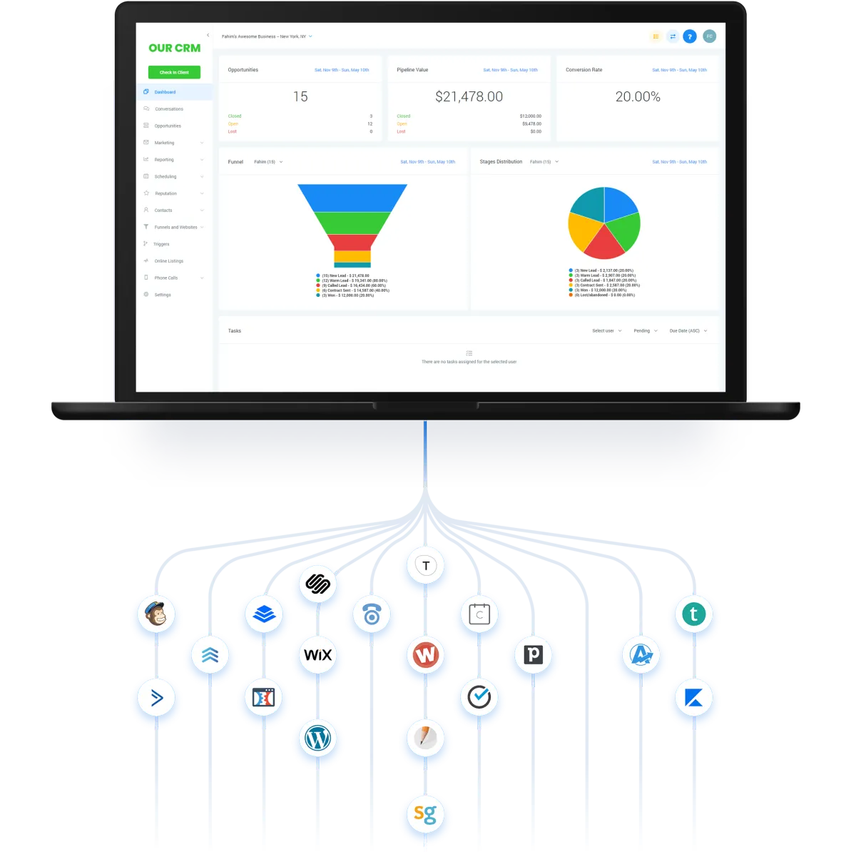 Build forms and funnel pages to capture leads, user automated sms, email, phone calls, voicemails, and Facebook Messages to nurture leads through custom pipelines, converse with leads & clients via text, phone, and Facebook Messenger (all in one stream!), and more!
